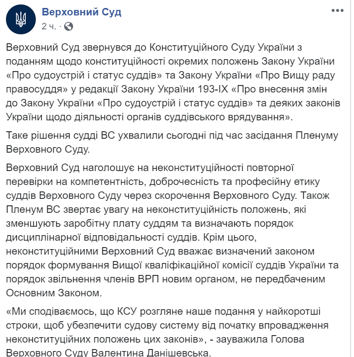 В Верховном суде Украины заявили о неконституционности повторной проверки его судей на компетентность, добропорядочность и профессиональную этику, которую хотят провести из-за сокращений численности судей, а также ряд положений новой судебной реформы.