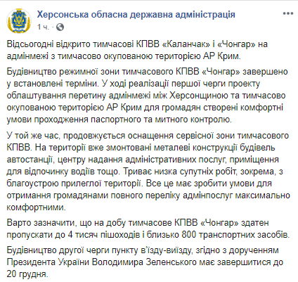 С 15 ноября открыты временные КПВВ "Каланчак" и "Чонгар" на административной границе с временно оккупированной территорией АР Крым после завершения строительства режимной зоны КПВВ "Чонгар". Об этом сообщается на странице Херсонской ОГА в соцсети.