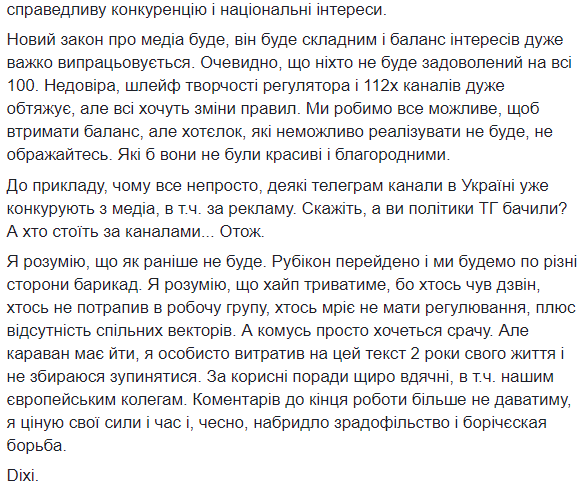 "Читаю комментарии по обнародованной презентации медийного закона, и вот что я вам скажу. Я понимаю, почему у нас нет Прессового совета. Здесь нет общих ценностей. Прежде всего ву тех, кто претендует на интеллектуальное лидерство.
