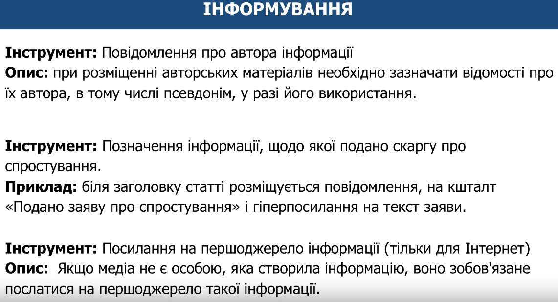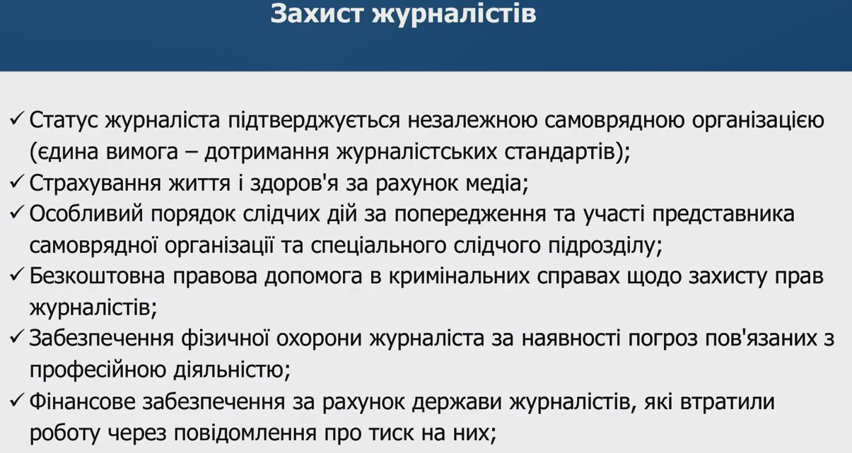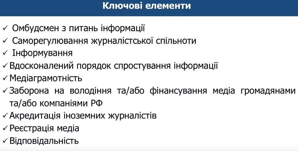 В их перечне обращает на себя внимание наличие должности омбудсмена по вопросам информации, регистрация СМИ ("у нас часть медиа за пределами правового регулирования, и это позволяет устраивать массированные атаки против украинской государственности"), запрет россиянам владеть медиа в Украине. А также "ответственность", указанная последним пунктом.