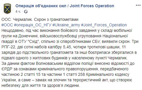 Сегодня, 16 ноября, военнослужащие Нацгвардии Украины вместе с представителями СБУ нашли тайник с боеприпасами в селе Чермалык (Донецкая область). Об этом сообщает пресс-центр ООС на своей странице в Facebook.