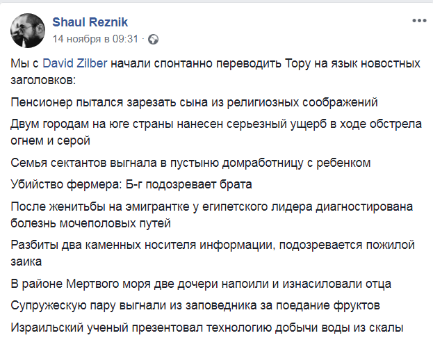 Израильские журналисты, выходцы из СССР, Шауль Резник и Давид Зильбер (заместитель главного редактора юмористического еженедельника "Бесэдер?" - Ред.) решили "переложить" Пятикнижие Моисея (Тору) на стиль и язык современных газетных заголовков. Свои варианты они предложили в Facebook, и вскоре в игру включились сотни комментаторов, которые уже не ограничились Торой, а использовали весь текст Библии.