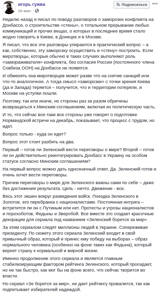 "Причем переговоры о мире для Зеленского важны сами по себе - даже без достижения результата. Цель - ничто. Движение - все. Весь этот экшен вокруг разведения войск. Поездка Зеленского в Золотое, его перебранка с националистами. Постоянная интрига - встретится ли он с Путиным или нет. Протесты и угрозы националистов и порохоботов, Федыны и Зверобой.