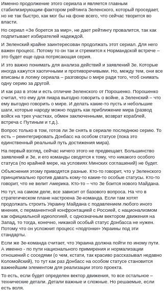 Именно продолжение этого сериала и является главным стабилизирующим фактором рейтинга Зеленского, который проседает, но не так быстро, как мог бы на фоне всего, что сейчас творится во власти. Но сериал "Зе борется за мир", не дает рейтингу провалится, так как подпитывает избирателей надеждой", - написал Игорь Гужва.