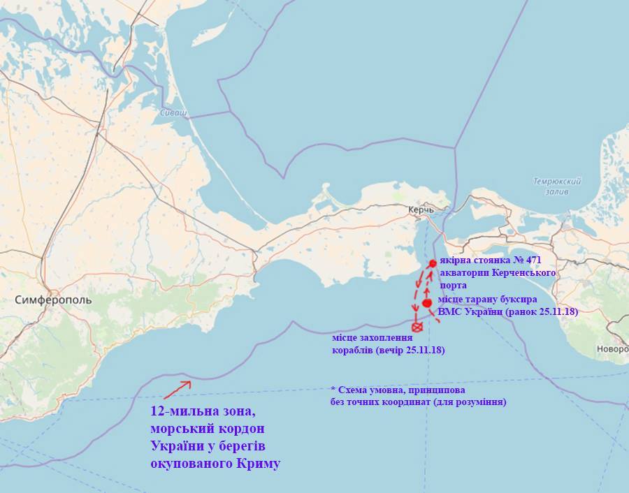 "Примерно в 10 милях (18,5 км) к востоку находится точка, где почти год назад произошел захват украинских военных катеров и буксира ВМСУ (карта 2)", - объяснил Клименко.