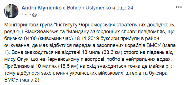 "Мониторинговая группа"Института Черноморских стратегических исследований, редакции BlackSeaNews и Майдана иностранных дел сообщает, что около 04:00 (киевское время) 18.11.2019 буксиры прибыли в район ожидания, где должна состояться передача захваченных кораблей ВМСУ (карта 1)", - написал Клименко.