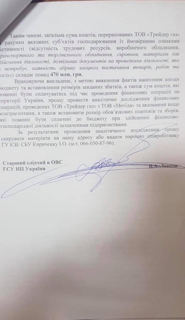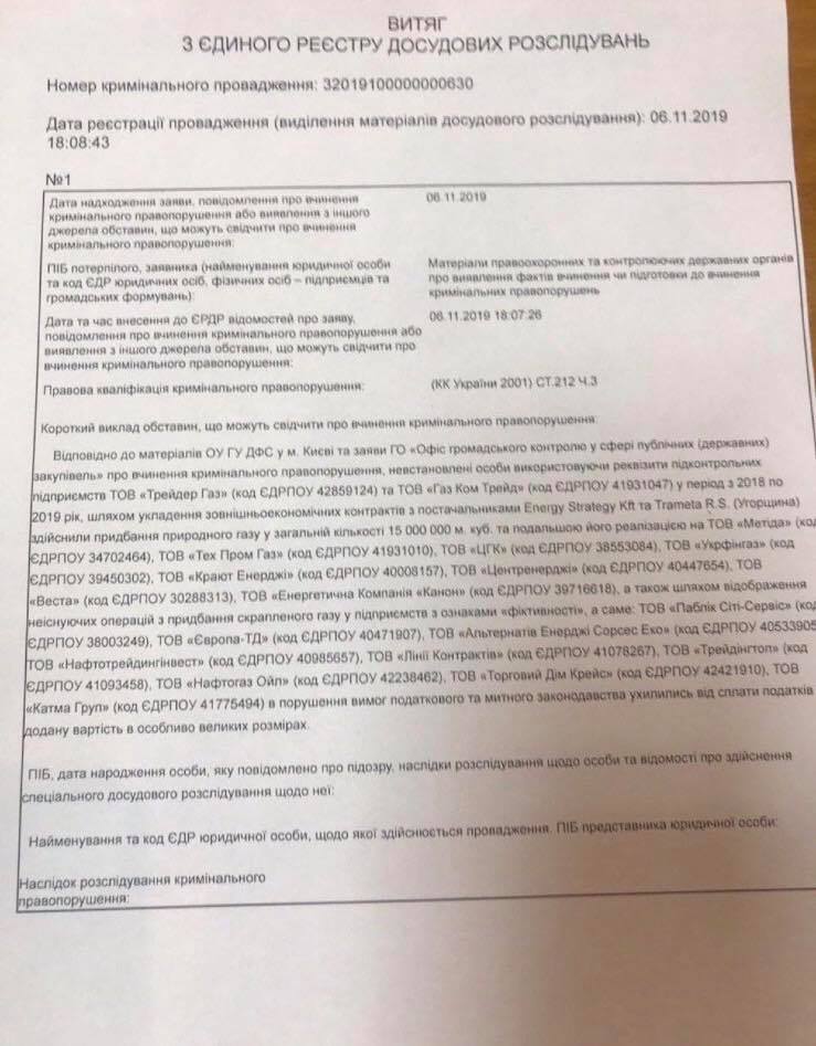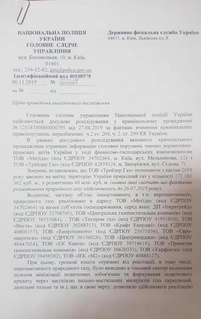 Сотрудники Главного следственного управления полиции Украины совместно с Государственной фискальной службой начали расследование по подозрению в контрабанде газа, уклонении от уплаты НДС, фиктивном налоговом кредите и непоставках газа потребителям по предоплате.