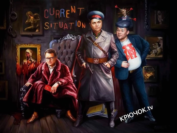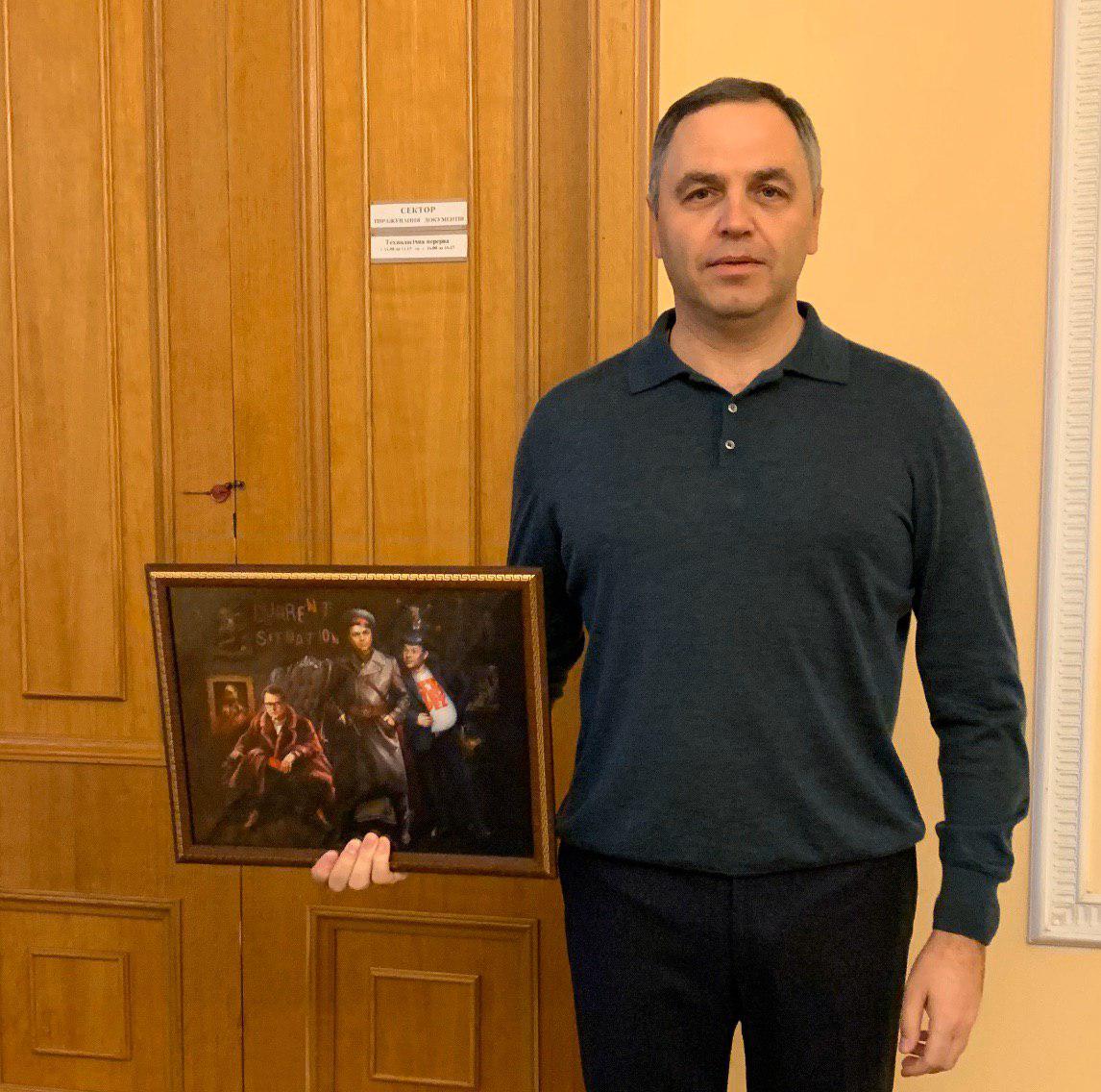 На картине изображены люди, очень похожие на самого Портнова в форме НКВД, на главу Офиса президента Андрея Богдана (облаченный в футболку с надписью "Сент-Тропе") и на заместителя главы Офиса президента Андрея Смирнова.