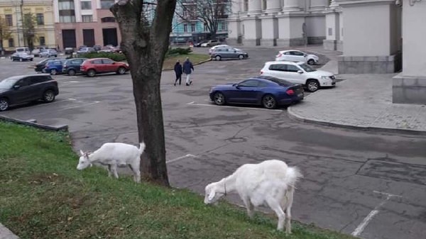 Оказалось, что две козочки, которые пасутся на газонах в Киеве, - это местная достопримечательность. Они уже давно живут в центре в одном из домов на улице Аллы Тарасовой, около престижного отеля. При этом киевляне часто видят их пасущимися на газонах Михайловской и Софийской площадей, и в сквере у Владимирского проезда.