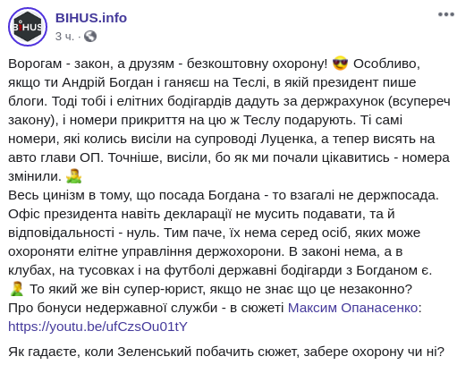 "Должность Богдана - это вообще не госдолжность. Офис президента даже декларации не должен подавать, и ответственности - ноль. Тем более, их нет среди лиц, которых может охранять элитное управления госохраны. В законе нет, а в клубах, на тусовках и на футболе государственные бодигарды с Богданом есть", - сказано в сообщении BIHUS info на Facebook.