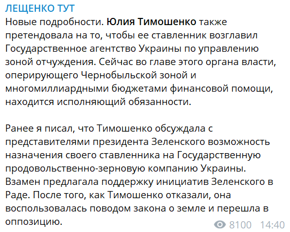 Позже у себя в Телеграм Сергей Лещенко добавил, что люди Тимошенко предлагали Зе-команде передать им в управление еще и Государственное агентство Украины по управлению зоной отчуждения.