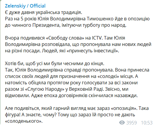 Хотел бы, чтобы все мы были честными до конца. Так, Юлия Владимировна действительно предлагала. Она принесла список своих людей для назначения на "сладкие" места. А взамен обещала в течение года голосовать за все законы вместе со "Слугой народа" в Верховной Раде. Конечно, мы отказали. Ведь эпоха договорняков закончилась навсегда.