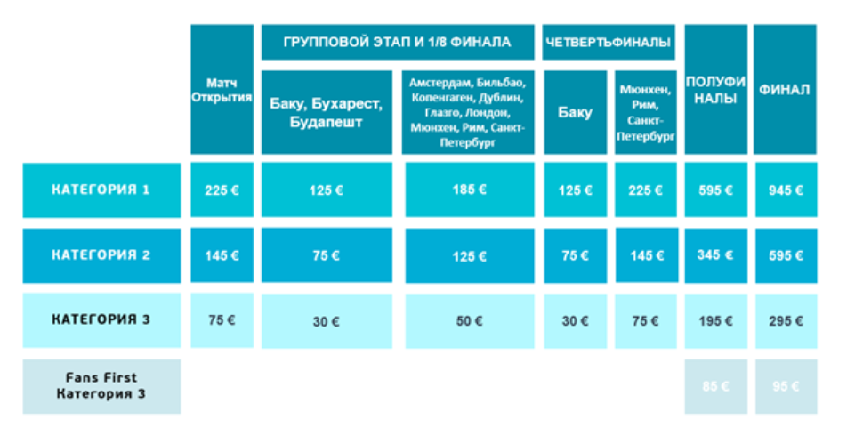 Билеты поделены на три ценовые категории, в зависимости от расположения места на стадионе. Самые доступные – на игры группового этапа и 1/8 финала в Баку, Бухаресте и Будапеште – от 30 евро. Самый дорогой билет на финал в Лондоне обойдется в 945 евро.