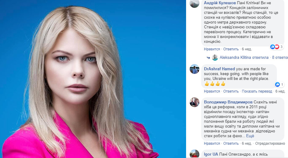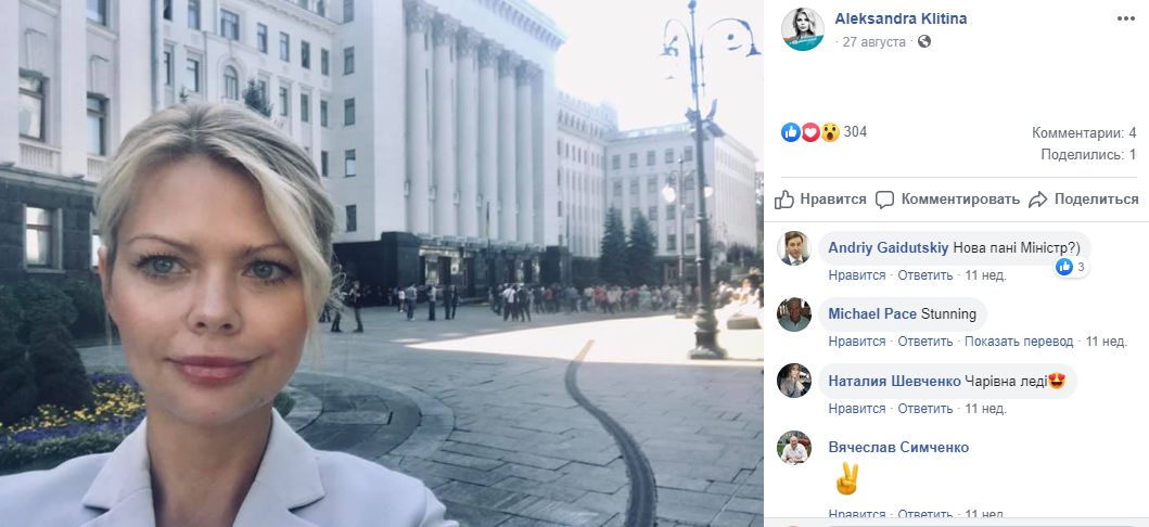 Александра Клитина работает замминистра инфраструктуры с 18 ноября. В министерстве она работает с 2015 года - советником министра до 2016 года и до 2018-го - директором группы поддержки реформ. Поле этого был перерыв на год - и вот после избрания нового Кабмина она стала замом министра Криклия.