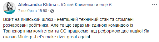 А вот ее визит как специалиста на Киевский шлюз, у которого "неутешительное техническое состояние". Впрочем, на лицах рабочих и команды транспортного комитетом и представителей ЕС разочарования не видно.