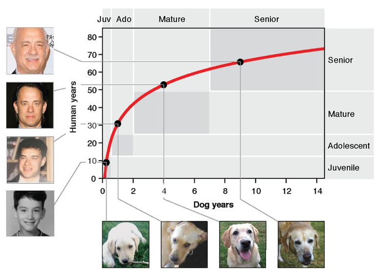 С помощью графика ученые убедились в том, что ключевые точки в жизни обоих организмов совпадают. Например, зубы начинают прорезываться в семь недель (0,13 года) у собак и в 9 месяцев (0,75 года) у людей. А средняя продолжительность жизни составляет примерно 12 лет у лабрадоров и около 70 лет у людей.