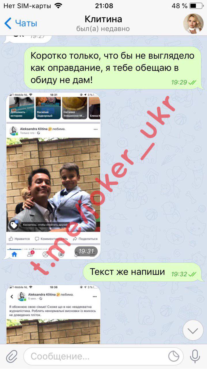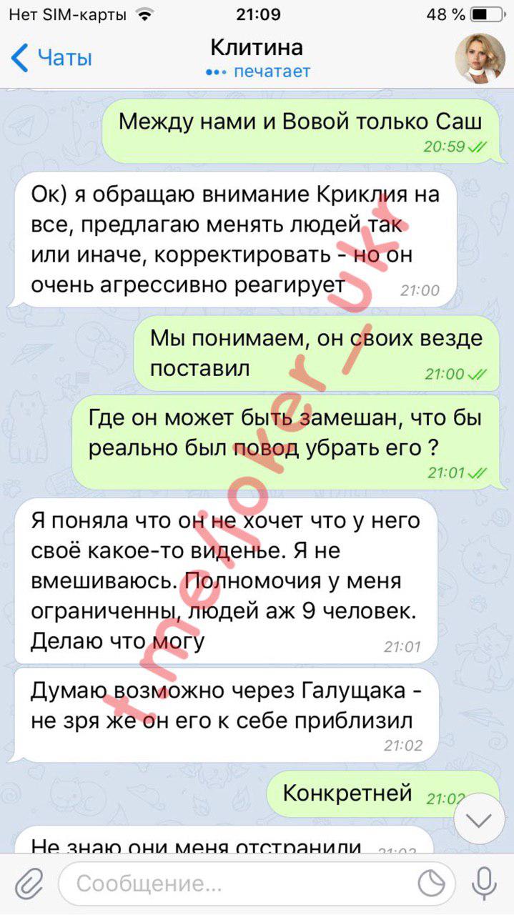 Также Клитина негативно оценила деловые качества своего начальника - министра инфраструктуры Криклия, написала, что он принимает на работу коррупционеров, что-то мутит с тендерами на "Укрзализныце", а также о том, что в министерстве на ключевых должностях стоят люди Ахметова.