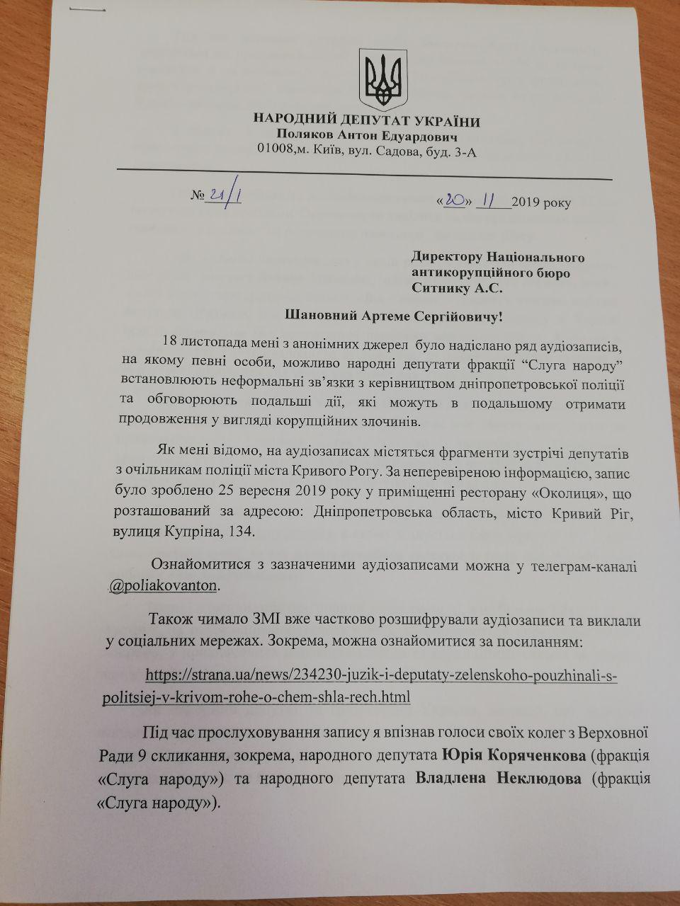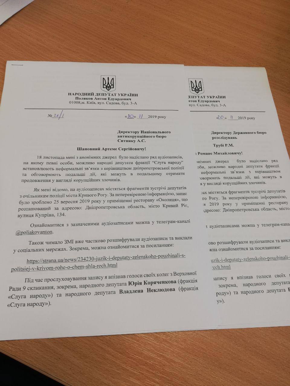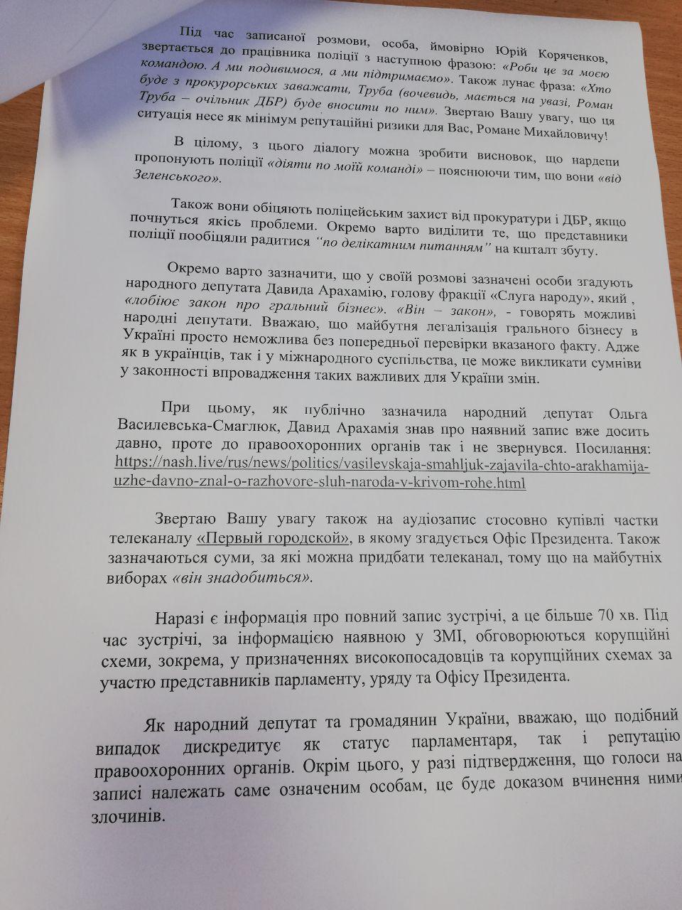 Речь в его письме идет о переговорах представителей фракции "Слуга народа" и руководства полиции Днепропетровской области, которые состоялись в одном из ресторанов Кривого Рога 25 сентября и получили название "Криворожгейта".