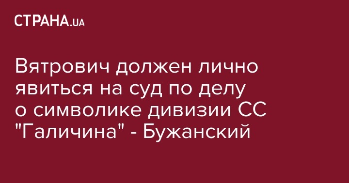 Экс-директор Украинского института национальной памяти Владимир Вятрович должен лично явиться на заседание по суда по иску об оправдании Институтом и лично Вятровичем символики 14-й дивизии СС Галичина. Об этом в своем Telegram написал депутат от фракции "Слуги народа" Макс Бужанский.