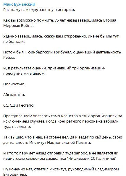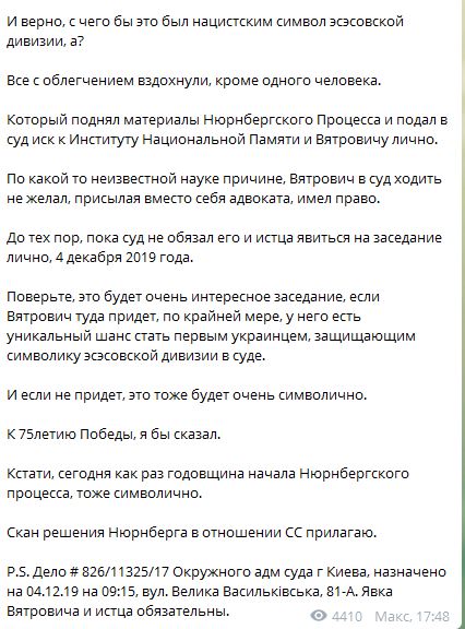 "По какой то неизвестной науке причине, Вятрович в суд ходить не желал, присылая вместо себя адвоката, имел право. До тех пор, пока суд не обязал его и истца явиться на заседание лично, 4 декабря 2019 года. Поверьте, это будет очень интересное заседание, если Вятрович туда придет, по крайней мере, у него есть уникальный шанс стать первым украинцем, защищающим символику эсэсовской дивизии в суде. И если не придет, это тоже будет очень символично. К 75-летию Победы, я бы сказал", - пишет Бужанский.