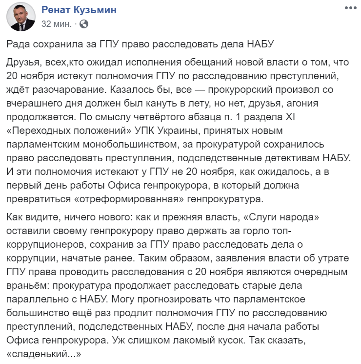 "Как видите, ничего нового: как и прежняя власть, "Слуги народа" оставили своему генпрокурору право держать за горло топ-коррупционеров, сохранив за ГПУ право расследовать дела о коррупции, начатые ранее. Таким образом, заявления власти об утрате ГПУ права проводить расследования с 20 ноября являются очередным враньём: прокуратура продолжает расследовать старые дела параллельно с НАБУ. Могу прогнозировать что парламентское большинство ещё раз продлит полномочия ГПУ по расследованию преступлений, подследственных НАБУ, после дня начала работы Офиса генпрокурора. Уж слишком лакомый кусок. Так сказать, "сладенький...", - говорится в опубликованном сообщении.
