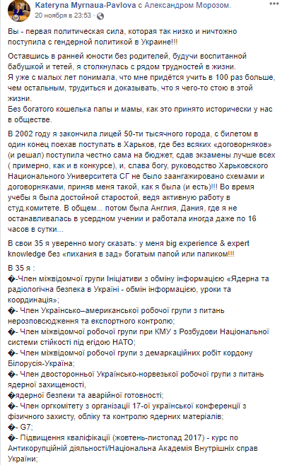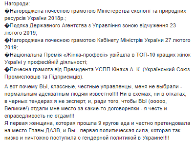 "Я первая женщина, которая прошла 9 кругов ада и честно претендовала на место Главы ДАЗВ, и Вы - первая политическая сила, которая так низко и ничтожно поступила с гендерной политикой в Украине!!!!" - возмутилась 35-летняя претендентка на должность.