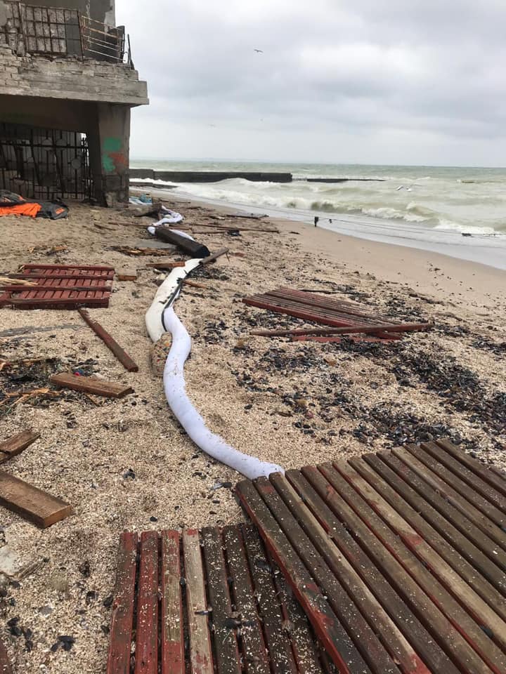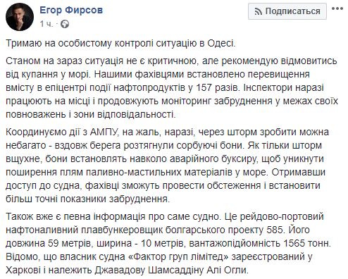 Согласно сообщению, ситуация не является критической, однако в море купаться однозначно не следует. Сейчас на месте работает бригада инспекторов, мониторящая уровень загрязнений. По причине шторма в ближайшее время не представляется возможным прекратить утечку нефтепродуктов из судна.