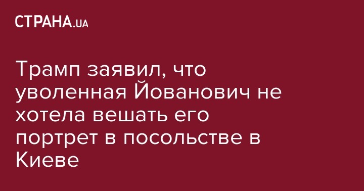 Президент США Дональд Трамп обвинил бывшего посла Мари Йованович, досрочно отозванную с Украины, в том, что она около года отказывалась вешать официальный портрет главы государства в здании посольства в Киеве. Об этом Трамп сказал во время интервью телеканалу Fox News.