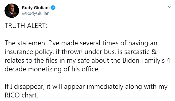 Джулиани добавил, что если он исчезнет, хранящийся в его сейфе компромат незамедлительно будет опубликован на основании RICO, то есть Федерального закона о противодействии рэкету и коррупции.
