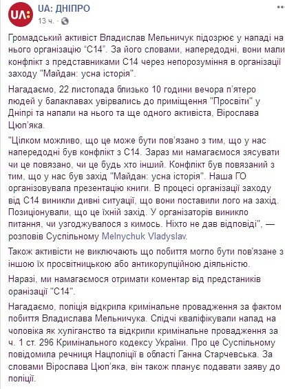 "Вполне возможно, что это может быть связано с тем, что у нас накануне был конфликт с С14. Сейчас мы пытаемся выяснить ли это связано, или это кто другой. Конфликт был связан с тем, что у нас было мероприятие "Майдан: устная история". Наша ГО организовывала презентацию книги. В процессе организации мероприятия от С14 возникли странные ситуации, что они поставили лого на запад. Позиционировали, что это их мероприятие. У организаторов возник вопрос, согласовывалось ли с кем-то. Никто не дал ответа", - сказал он.