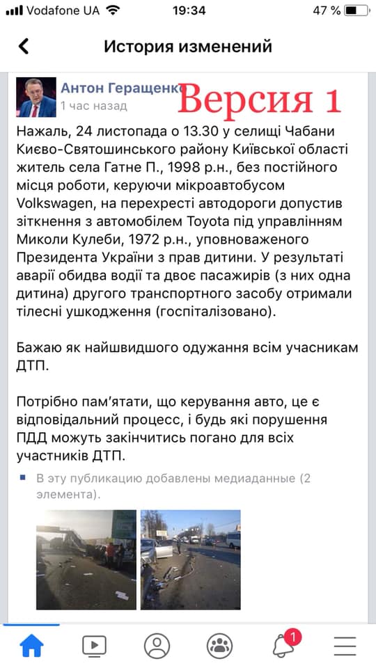 Антон Геращенко- заместитель министра внутренних дел Украины, в своем посте относительно аварии детского омбудсмена Николая Кулебы, который выехал на перекрестке на красный, сделал 11 правок, пытаясь "оправдать" действия чиновника.