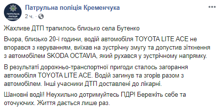 "Ужасное ДТП произошло вблизи села Бутенко. Вчера, около 20:00, водитель автомобиля Toyota LiteAce не справился с управлением, выехал на встречную полосу и столкнулся с автомобилем Skoda Octavia, который двигался во встречном направлении. В результате ДТП произошло возгорание автомобиля Toyota LiteAce. Водитель погиб и сгорел вместе с автомобилем", - говорится в сообщении патрульной полиции.