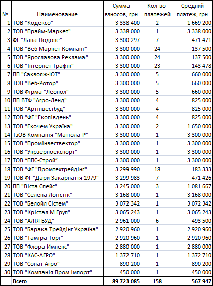 Юридических лиц - спонсоров у политсилы немного - всего 30. "Страна" составила их рейтинг. Из него видно, что стандартная ставка спонсорского платежа с одной компании составила порядка 2,9-3,3 миллиона гривен.