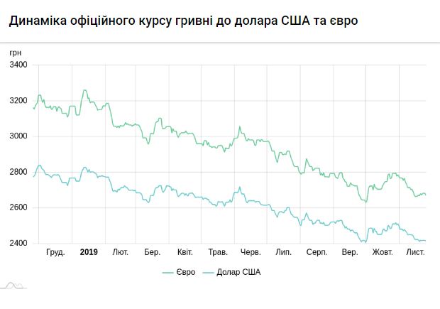 Национальный банк Украины (НБУ) на 26 ноября 2019 года установил официальный курс на уровне 24,05 гривен за доллар, что на 11 копеек ниже по сравнению с предыдущим банковским днем. Об этом свидетельствуют данные на сайте регулятора.