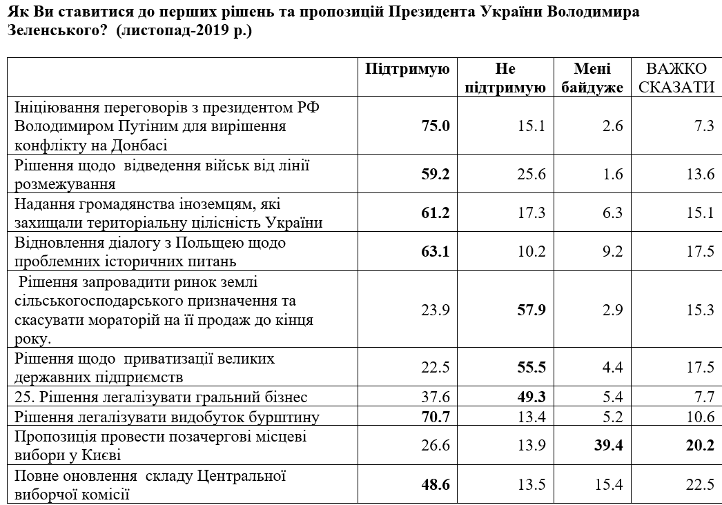 Но есть у Зеленского и резко непопулярные инициативы. Почти 58% против продажи сельскохозяйственной земли, более 55% - против приватизации госпредприятий. И 49% украинцев не хотят, чтобы власть легализовывала игорный бизнес.