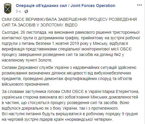 По словам заместителя председателя СММ ОБСЕ в Украине Марка Этерингтон, украинская сторона выполнила все обязательства Минских договоренностей в части, касающейся процесса разведения сил и средств. Оно произошло зеркально как со стороны Украины, так и с противоположной.
