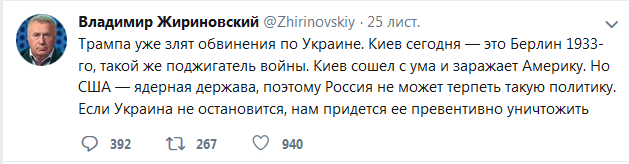 "Трампа уже злят обвинения по Украине. Киев сегодня - это Берлин 1933-го, такой же поджигатель войны. Киев сошел с ума и заражает Америку. Но США - ядерная держава, поэтому Россия не может терпеть такую политику. Если Украина не остановится, нам придется ее превентивно уничтожить", - написал Владимир Жириновский.