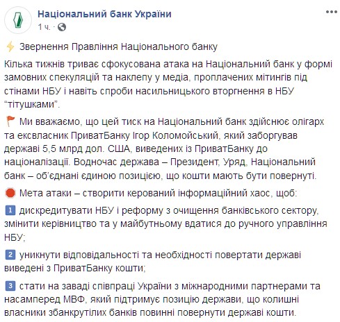 "Несколько недель продолжается сфокусированная атака на Национальный банк в форме заказных спекуляций и клеветы в СМИ, проплаченных митингов под стенами НБУ и даже попытки насильственного вторжения в НБУ "титушек". Мы считаем, что это давление на Национальный банк осуществляет олигарх и экс-владелец Приватбанка Игорь Коломойский, который задолжал государству 5,5 млрд долл. США, выведенных из Приватбанка до национализации", - говорится в сообщении.