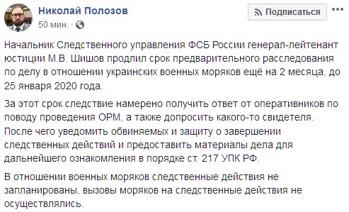 "Начальник Следственного управления ФСБ России генерал-лейтенант юстиции М.В. Шишов продлил срок предварительного расследования по делу в отношении украинских военных моряков ещё на 2 месяца, до 25 января 2020 года. За этот срок следствие намерено получить ответ от оперативников по поводу проведения ОРМ, а также допросить какого-то свидетеля", - сказал он.