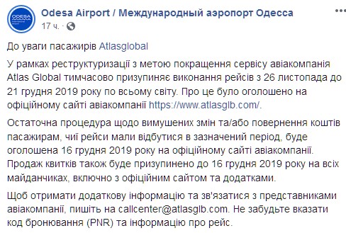 "В рамках реструктуризации с целью улучшения сервиса авиакомпания Atlasglobal временно приостанавливает выполнение рейсов с 26 ноября по 21 декабря 2019 по всему миру", - говорится в сообщении.