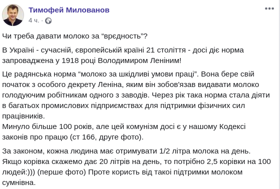 "Надо давать молоко за "вредность"? В Украине - в современной европейской стране XXI века - до сих пор действует норма, введенная в 1918 году Владимиром Лениным! Это советская норма - "молоко за вредные условия труда", - возмутился министр.