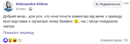 "Добрый вечер - для всех, кто хочет услышать комментарии от меня по поводу моей отставки я организую снова брифинг, время и место сообщу завтра" - написала бывшая замминистра.