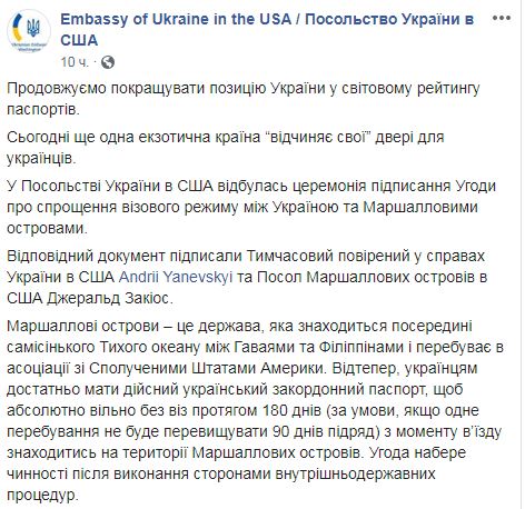 "Сегодня еще одна экзотическая страна "открывает свои" двери для украинцев. В Посольстве Украины в США состоялась церемония подписания Соглашения об упрощении визового режима между Украиной и Маршалловыми острова", - сказано в сообщении.