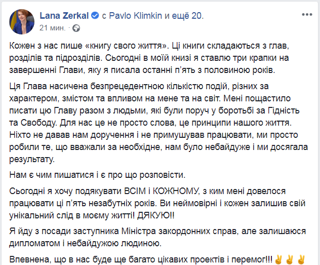 В конце поста она поблагодарила сотрудников и заверила, что остается "дипломатом и неравнодушным человеком".
