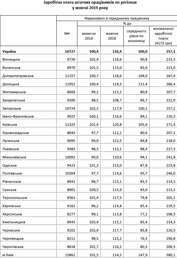 По данным статведомства, наибольший рост средней заработной платы штатных работников в октябре 2019 года по сравнению с октябрем 2018 года наблюдался в Луганской (на 22,5%), Киевской (на 20,8%), Николаевской (на 20,6%), Донецкой (на 19,5%), Днепропетровской (на 18,6%), Запорожской (на 17,9%), Черкасской (на 17,7%), Тернопольской (на 17,5%), Ивано-Франковской и Винницкой (на 16,6%), Черниговской (на 16,2%), Сумской (на 15,9%), Черновицкой и Хмельницкой (на 15,2%), Ривненской (на 15,1%), Одесской и Волынской (на 15%), Харьковской (на 14,8%), Полтавской (на 14,6%), Херсонской (на 13,8%), Житомирской (на 13,2%), Львовской (на 13,1%), Кировоградской (на 12,2%) областях и в Киеве (на 14,5%).