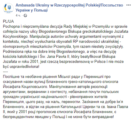 "Поспешное и опрометчивое решение городского совета в Перемышле об отмене названия улицы Блаженного греко-католического епископа Иосафата Коциловского. Манипулирование авторов резолюции аргументами, вырванными из контекста, нежелание услышать польских граждан украинской национальности - равноправных жителей Перемышля, в этот раз, к сожалению, победили. Посягательство на доброе имя Блаженного, а затем на решение Католической церкви и св. Иоанна Павла II, который в 2001 году провозгласил епископа Иосафата Блаженным, является беспрецедентным явлением в Польше и не может быть оправдано", - говорится в сообщении.