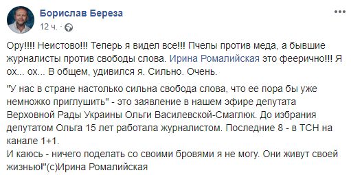 Экс-депутат Борислав Береза назвал ситуацию "пчелы против меда": "Ору!!!! Неистово!!! Теперь я видел все!!! Пчелы против меда, а бывшие журналисты против свободы слова. Ирина Ромалийская это феерично!!! Я ох... ох... В общем, удивился я. Сильно. Очень".