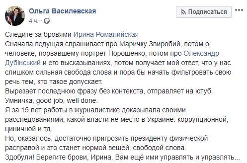 "Следите за бровями, Ирина Ромалийская. Сначала ведущая спрашивает про Маричку Звиробий, потом о человеке, порвавшем портрет Порошенко, потом про Александра Дубинского и его высказывания, потом получает мой ответ, что у нас слишком сильная свобода слова и пора бы начать фильтровать свою речь тем, кто такое допускает.