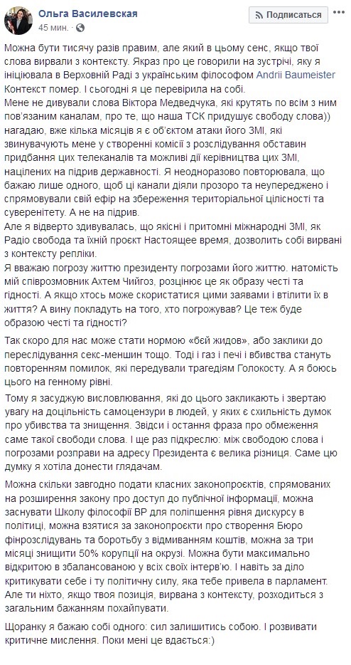 Народный депутат от партии "Слуга народа" и журналист по профессии Ольга Василевская-Смаглюк прокомментировала ситуацию с позицией по свободе слова. Об этом она написала у себя в Facebook.