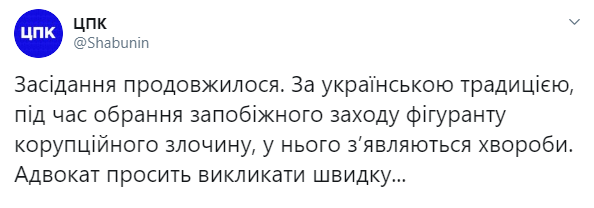 Скорую помощь для бизнесмена Вадима Альперина, которого подозревают в организации незаконной схемы на одесской таможне, попросили вызвать во время заседания Антикоррупционного суда, которое началось в 12:00 в пятницу, 29 ноября. Об этом в своем микроблоге в Twitter сообщает Центр противодействия коррупции.